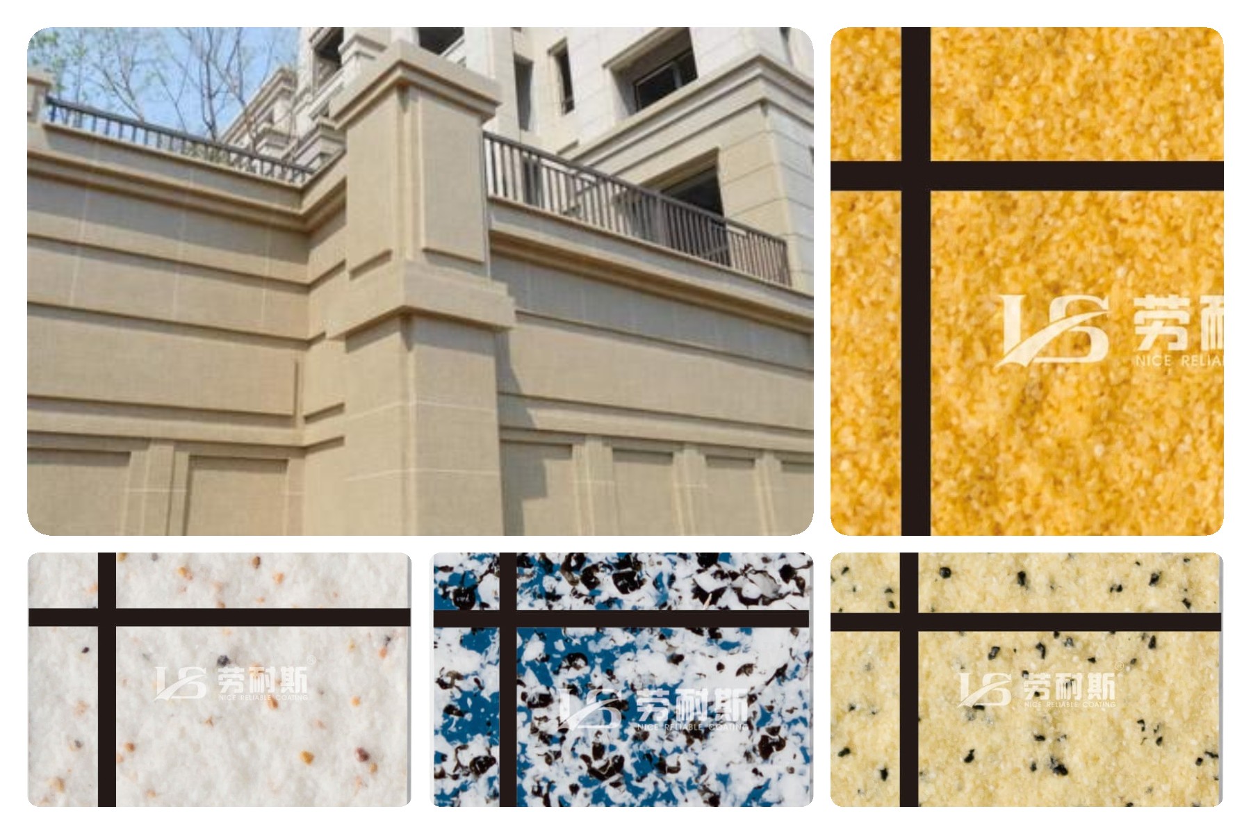 多彩涂料體系中搭配不同的中層漆分別可以達到光面、毛面、火燒面、荔枝面等仿石效果。